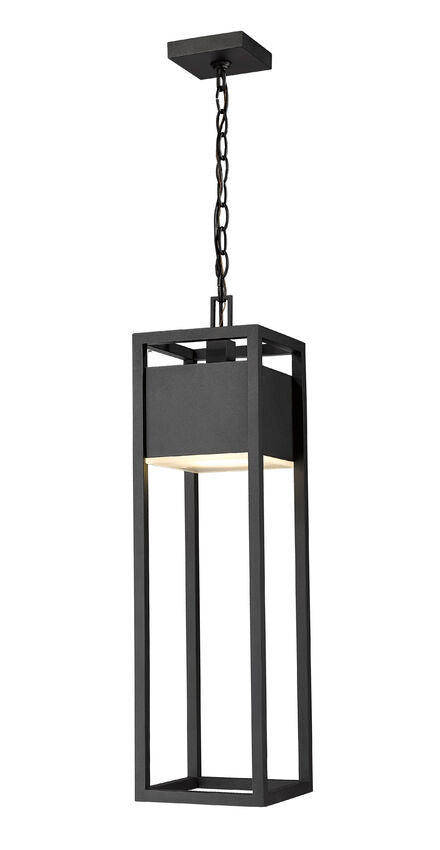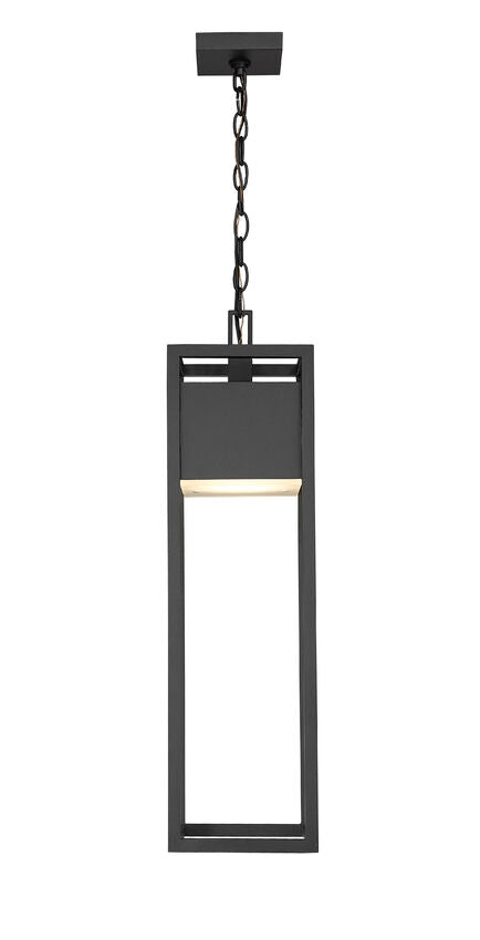 From the Barwick collection comes this contemporary outdoor ceiling fixture, perfect for mounting above a porch entryway. With an open rectangular aluminum cage in a deep black finish, this ceiling fixture hangs by a chain mount and can complement existing building facade colors. With an elegant touch, this outdoor ceiling fixture also comes with an energy-efficient LED-integrated lamp tucked beneath an etched glass plate.