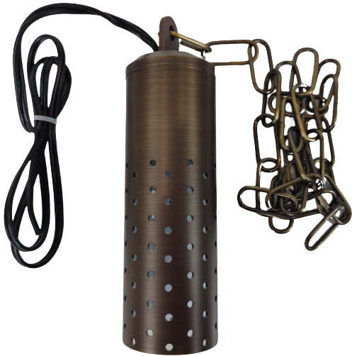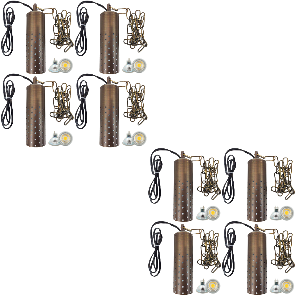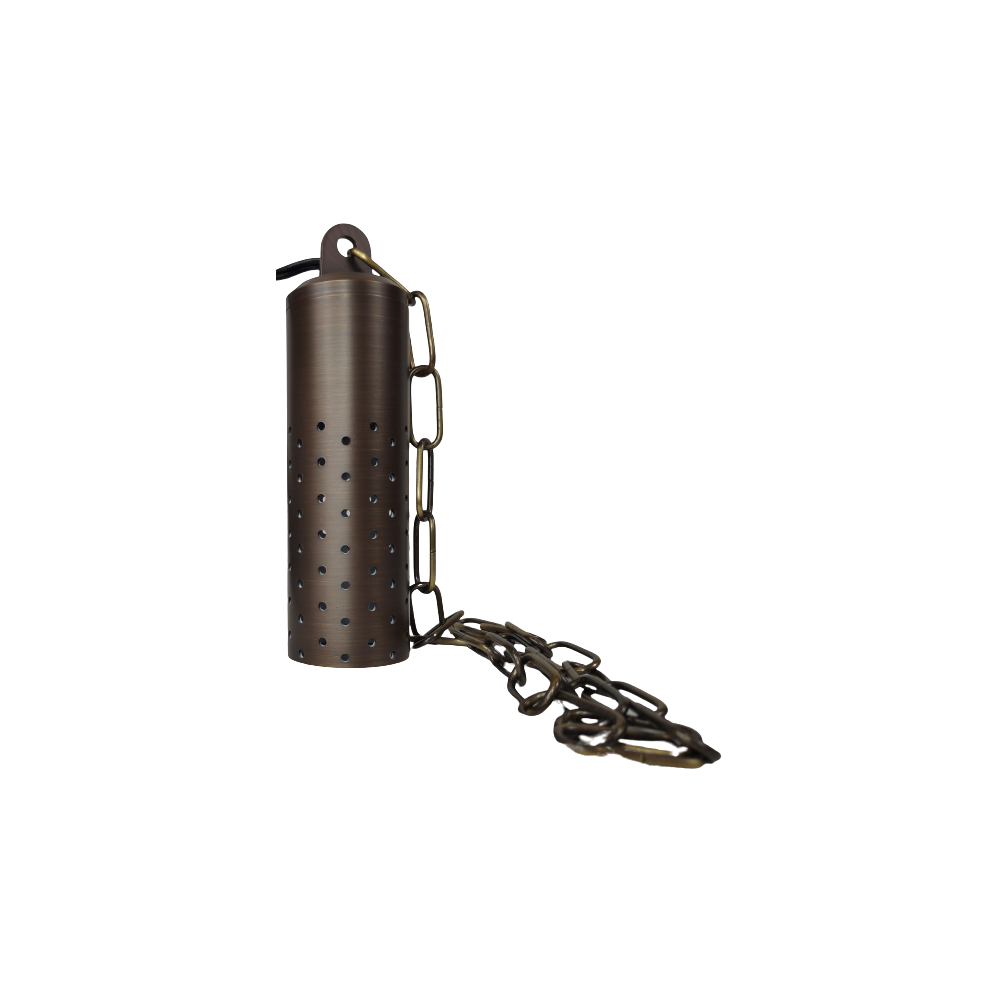 This vintage style LED brass hanging pendant light creates a center of attraction with its unique and elegant design to your interior or exterior space. This low voltage cylinder pendant spotlight is made of heavy-duty cast brass which gives a solid construction for durability and longevity. With the holes scattered around the sides of the fixture, it gives it a star lighting design as it shines on object and landscaping around it. A 40" chain is also included so that you can make it a suitable height by shortening the chain to fit your house.