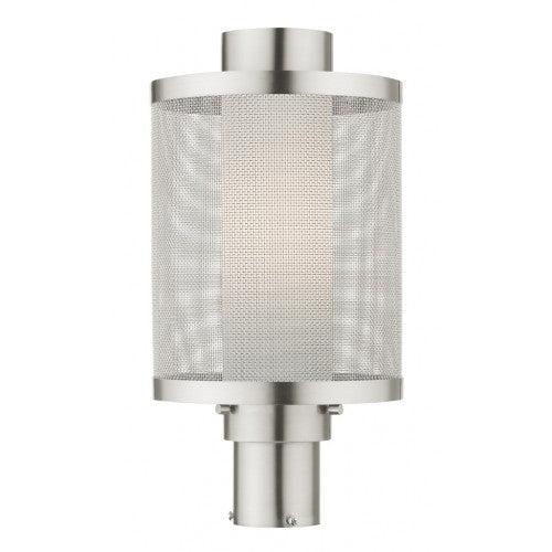 The Nottingham outdoor collection has a clean, crisp look and contemporary appeal. This single light stainless steel large post top lantern has a brushed nickel finish and features a sleek stainless steel mesh shade with satin opal white glass.