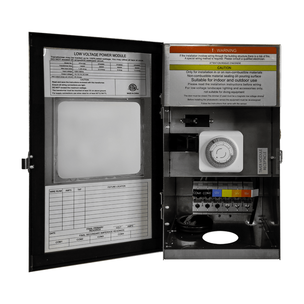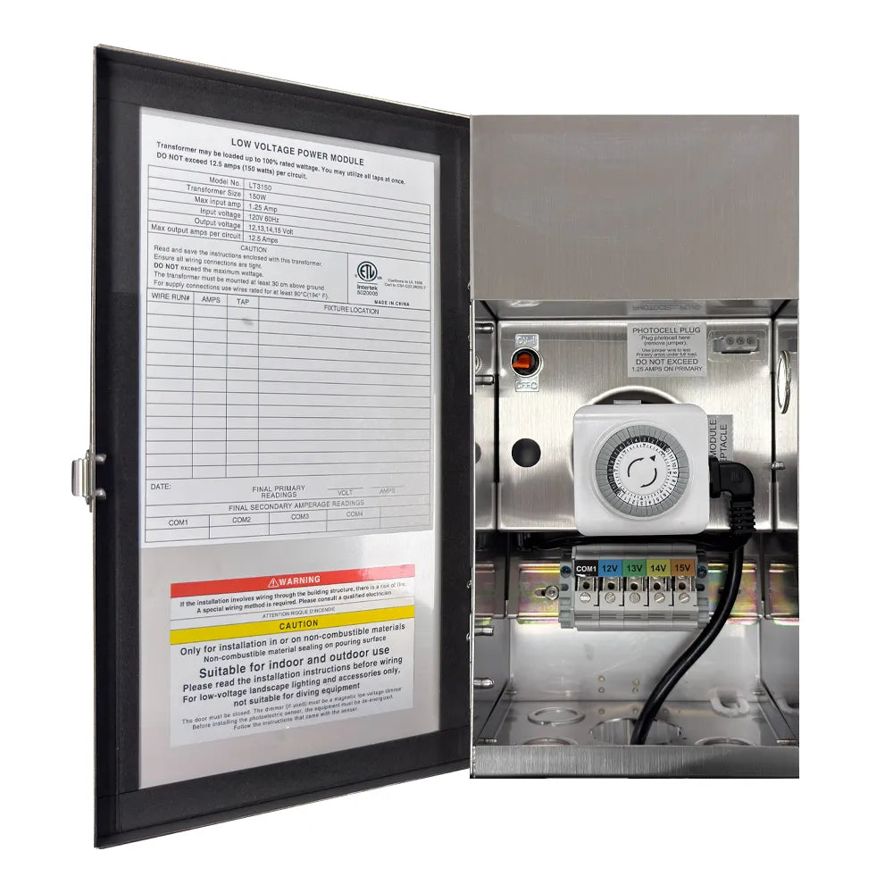 Landscape Lighting Transformer with Timer: Ideal for landscape lighting voltage control, a landscape lighting transformer with a timer combines the convenience of timed control with the safety and energy savings of a low-voltage system. By incorporating a timer into your landscape power unit, you can automate your lighting setup to turn on when you need it most, reducing energy consumption and enhancing security.