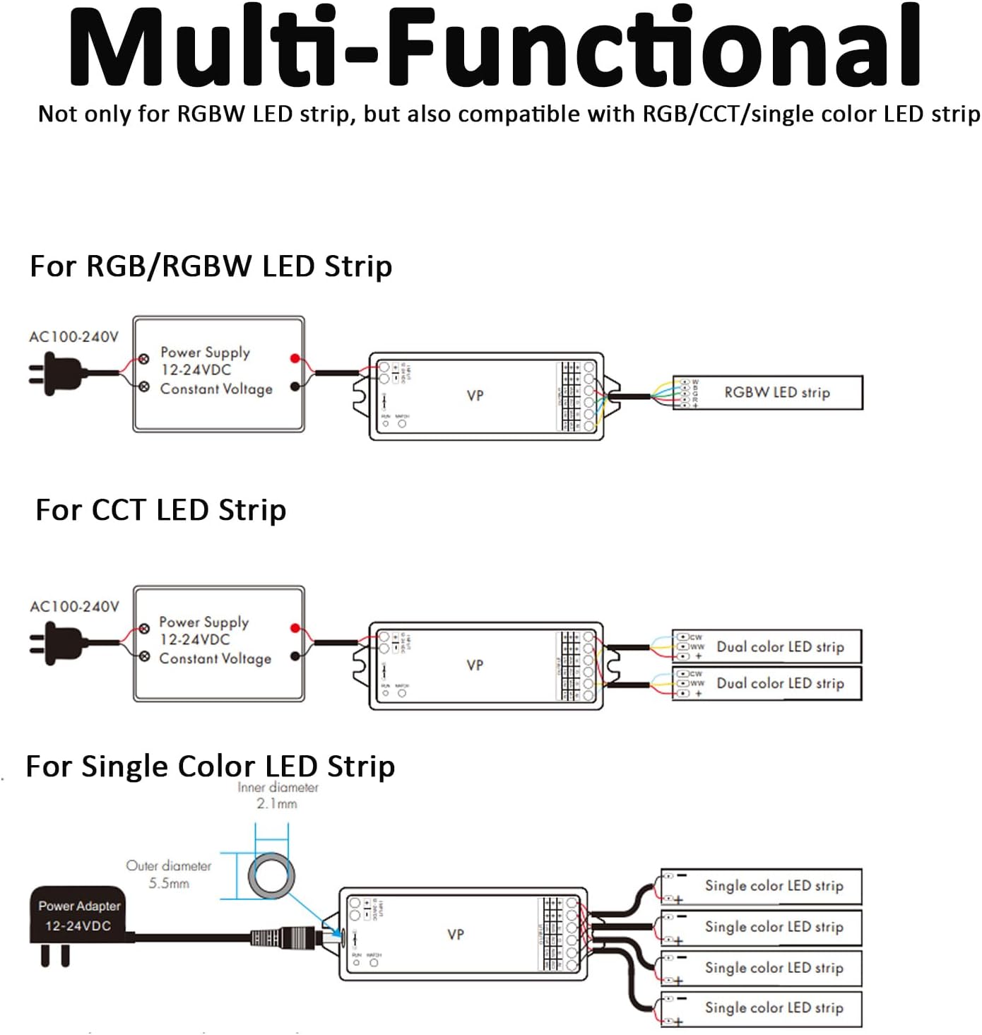 Compatible: The V3 LED controller kit works with all DC 12-24V RGBW, RGB, CCT, single color LED strip including SMD and COB. Can not work with IC LED strip such as WS2811, WS2812B etc.