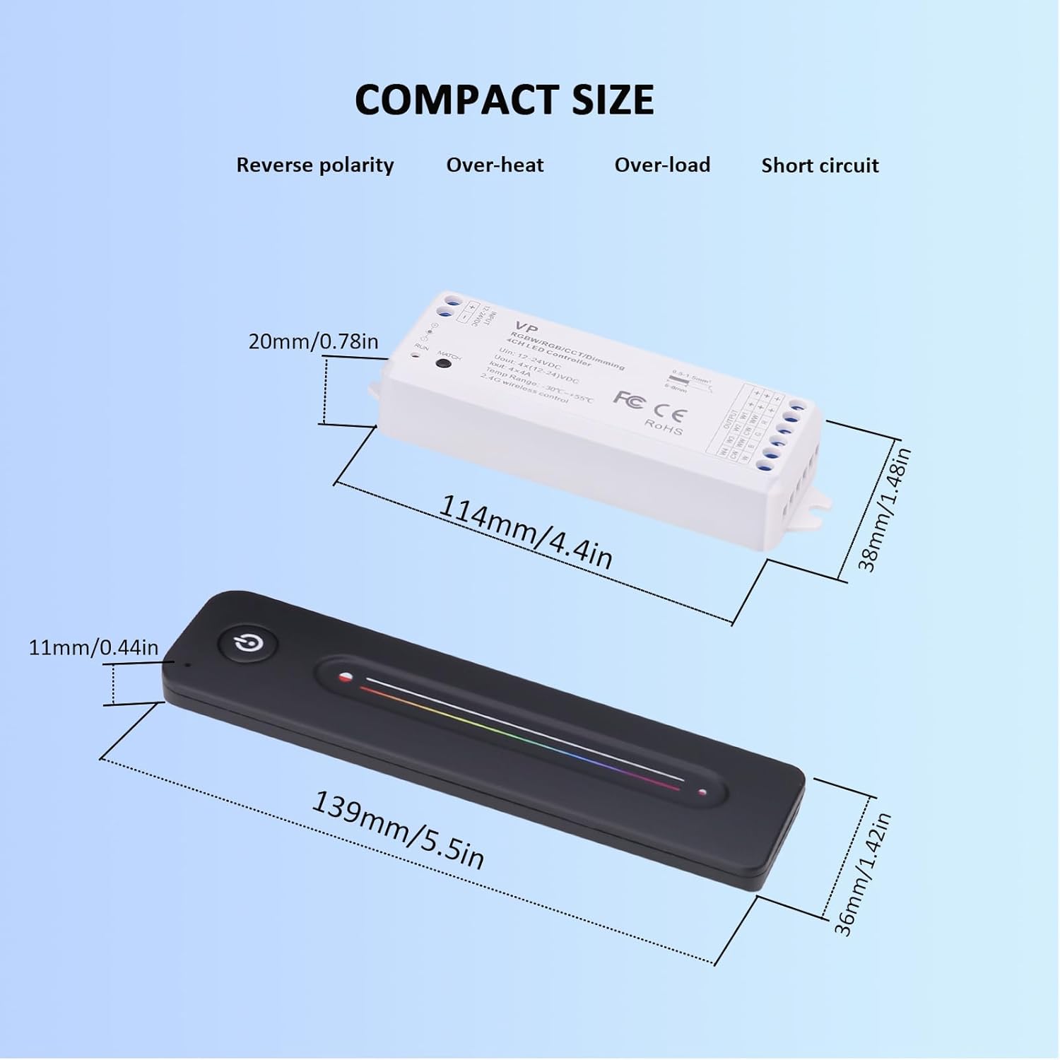 Compatible: The V2 LED controller kit is designed for dc 12-24V tunable white LED strip color change and brightness dimming or single color led strip brightness adjustment, works with 5050, 3528, 2835, COB, Neon. Max current 5A/CH.