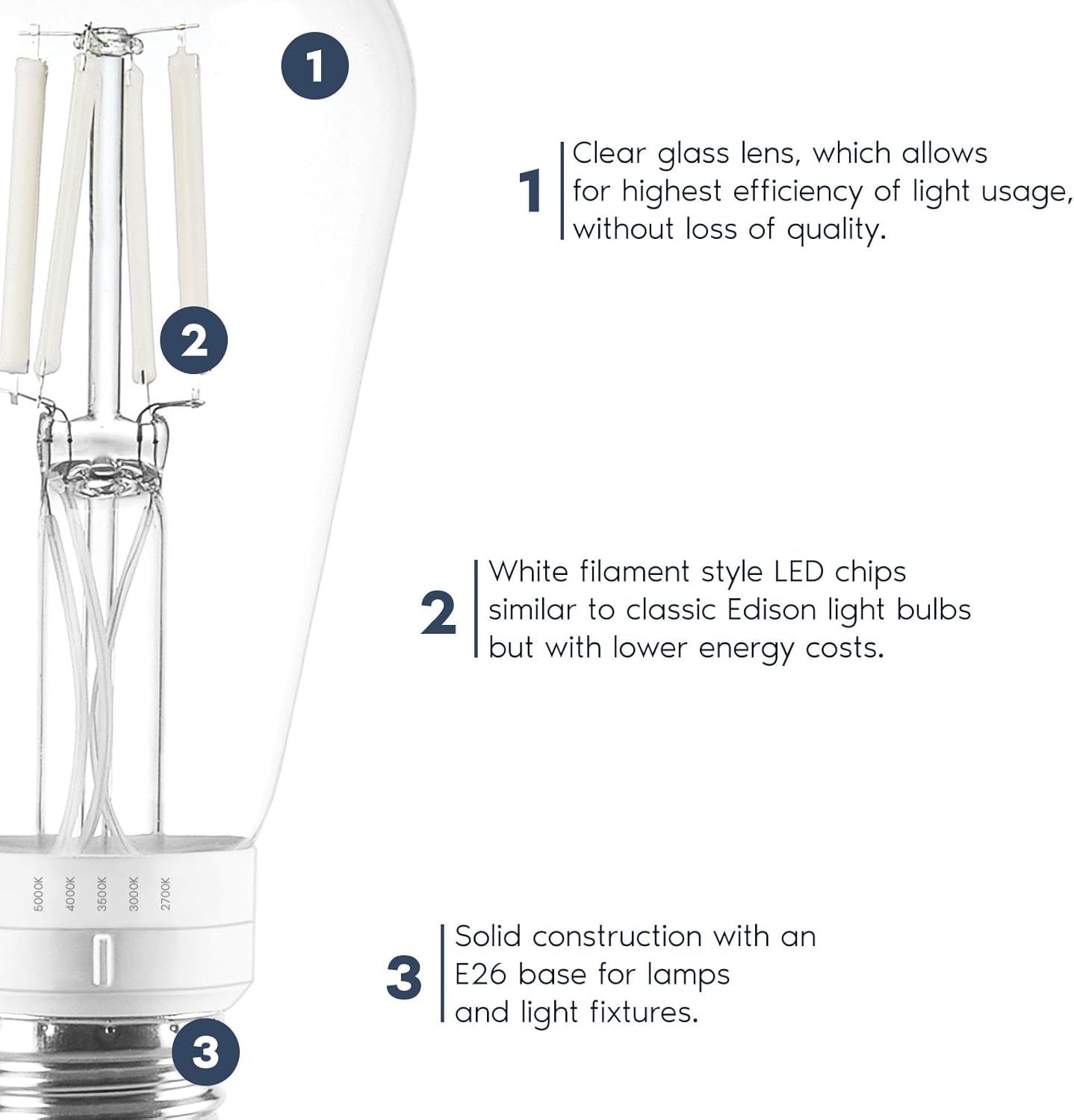 Producing as much light as 60W halogen or incandescent light bulb with a fraction of the energy, these E26 ST19-Shape Filament 4.5W LED Medium-Base light bulbs are designed to save up to 80% of your electricity bill on lighting. This novelty shatterproof plastic made LED light bulb features a wide beam, is heat resistant, energy saving, dimmable, durable and easy assemble. This 500 Lumens, 90 CRI, LED medium base light bulb is made to ensure a long lifespan, over 15,000 hours, which saves effort and maintenance costs on changing bulbs frequently.