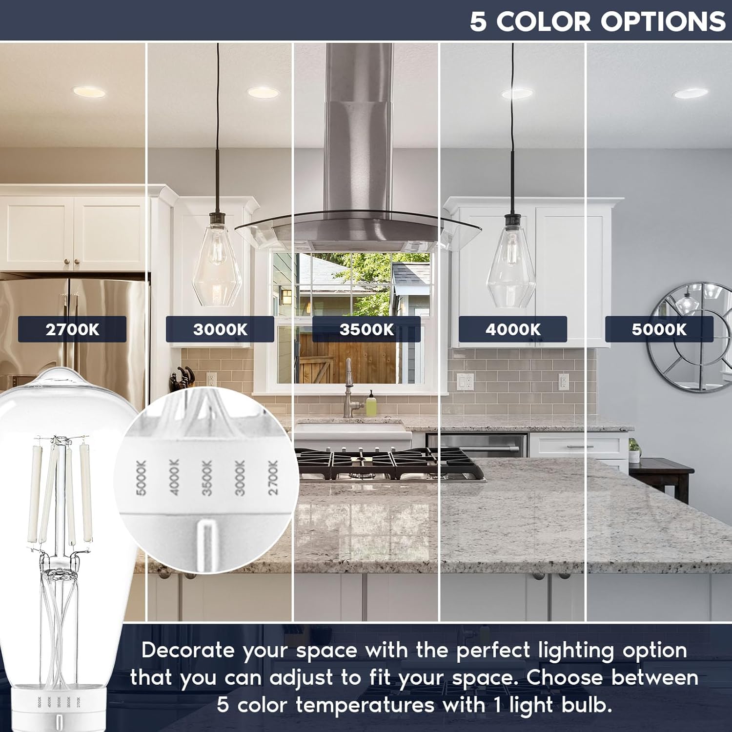 Certified for environmental protection standards and compliant with Waste Directive, so no UV or IR radiation, no hazardous emissions, mercury-free, and safe to use in your living environments. The light color temperature of this bulb has selectable 5CCT 2700K/3000K/3500K/4000K/5000K, perfect for post lights in front of homes or for wall sconces.